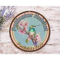 Introducing the Pollinator Habitat Garden Sign by Life In Color Design. Made in the USA from lightweight, durable aluminum, this 8" round sign features a floral wreath and bee design with the text "Pollinator Habitat Pesticide Free." It is UV-resistant and the design is sublimated directly into the metal, ensuring no lifting or peeling of images. The sign includes a 3/16" mounting hole for easy installation (stake not included). Promote pollinator habitats with this eye-catching and long-lasting sign.
